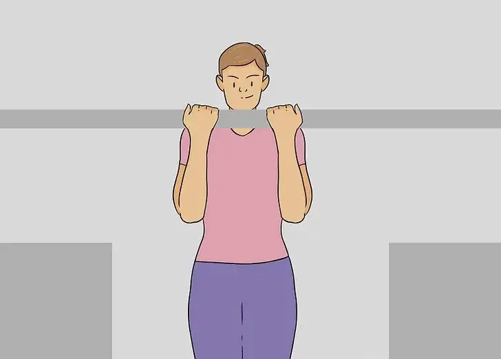 训练步骤:将脚放在弹力带上并抓住杠铃,双手分开与肩同宽。把自己拉起来,让你的下巴在杠铃上方,保持该姿势 1 下,然后再将自己放低,尝试做 1-2 组,每组 5-10 个辅助引体向上。