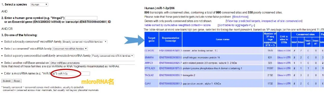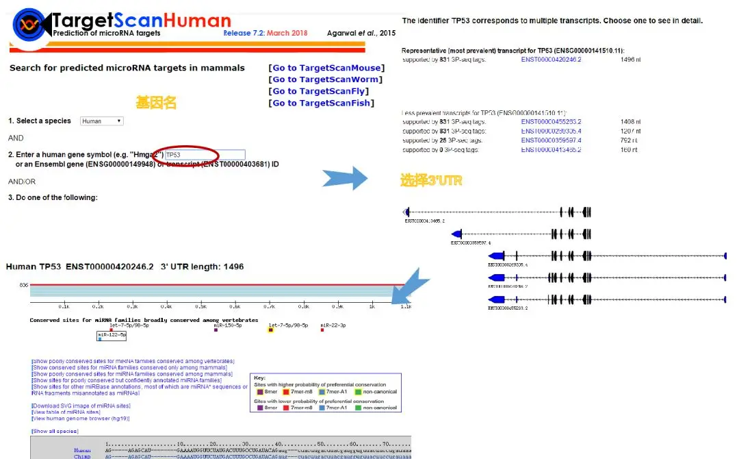 TargetScan用起来很简单方便,输入基因名能查出某个基因3’UTR可能的作用多个microRNA。最新版的TargetScan还人性化的列出目前发现的多种3’UTR。输入microRNA名则能查出某个microRNA可能作用的多种靶基因。