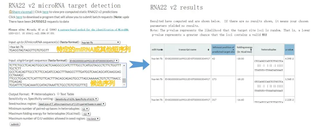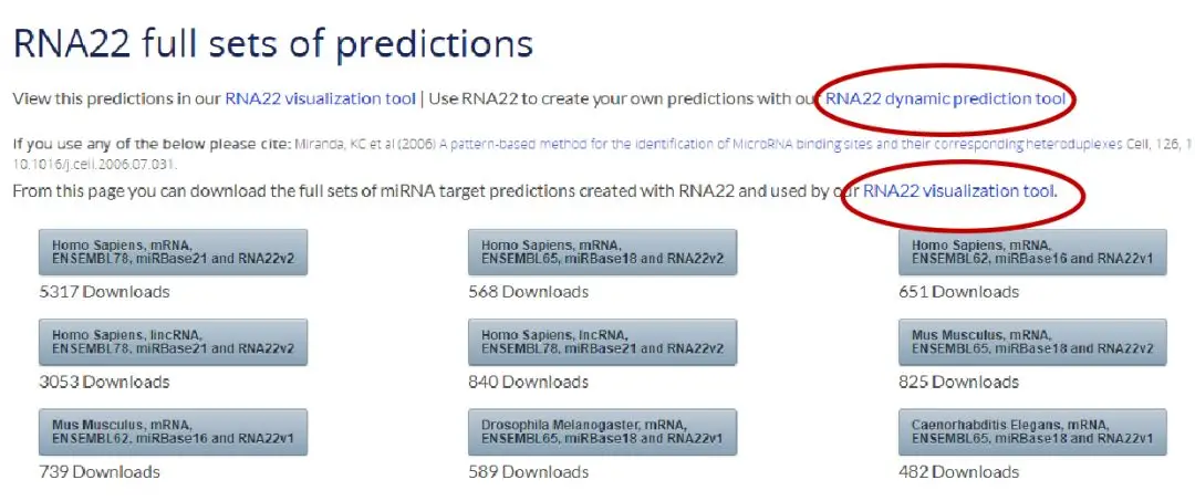 RNA22与miRDB类似,能预测miRNA的靶基因,预测mRNA、LincRNA、LncRNA的候选作用miRNA(RNA22 visualization tool )。此外,其在线预测特定基因序列和特定miRNA序列的作用位点的功能强大(RNA22 dynamic prediction tool)。