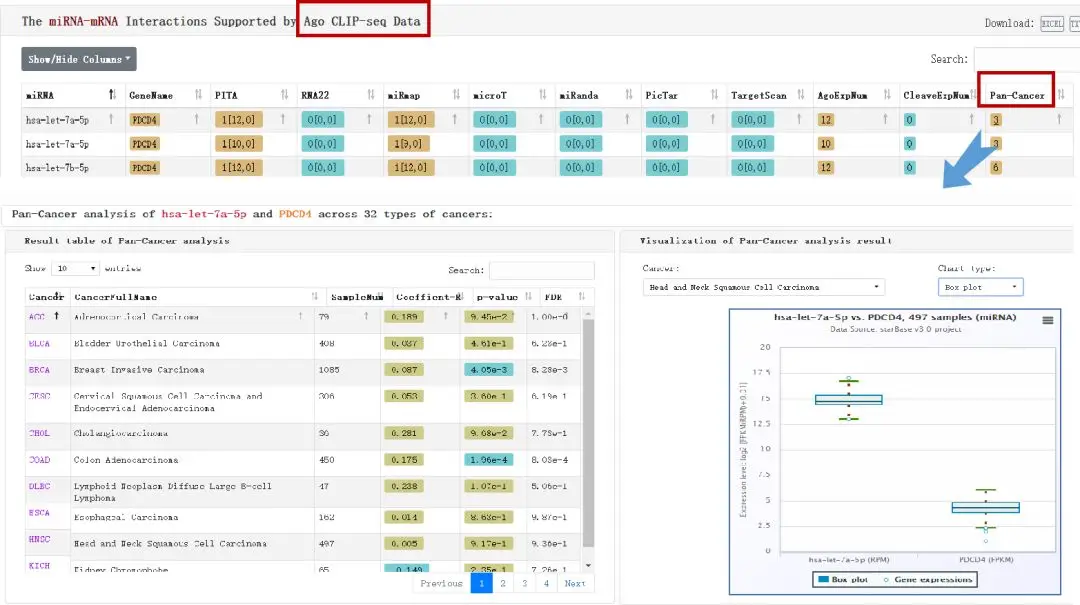 starBase收集了基于Ago-Seq数据的miRNA与mRNA、多种ncRNA的相互作用结果。很有意义的是以散点图和直方图绘制来了多种肿瘤中miRNA与靶基因的表达水平。