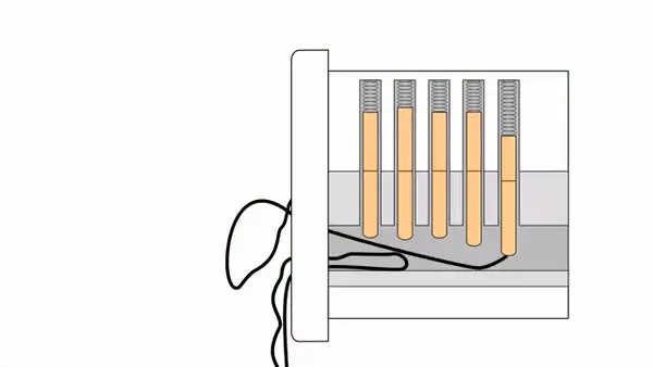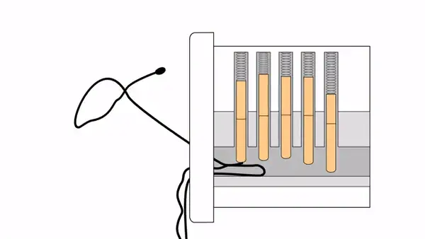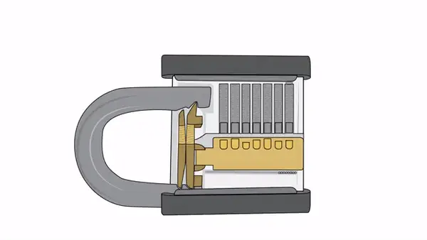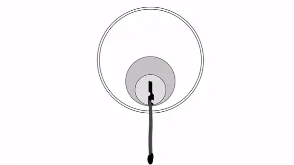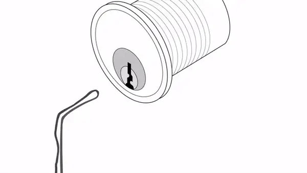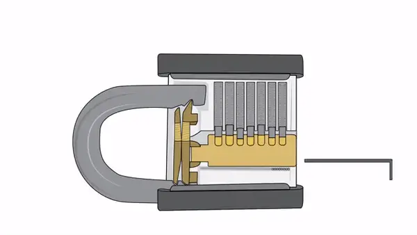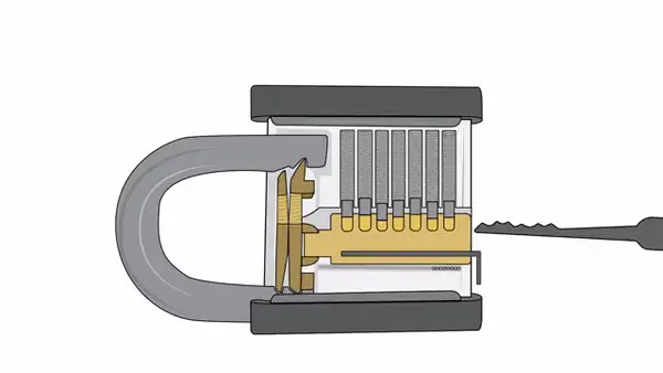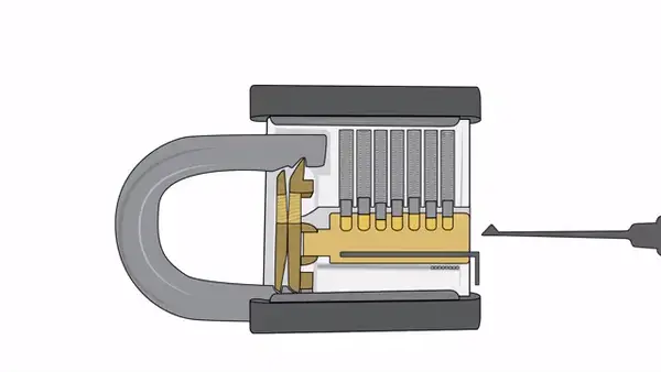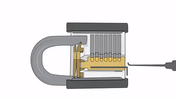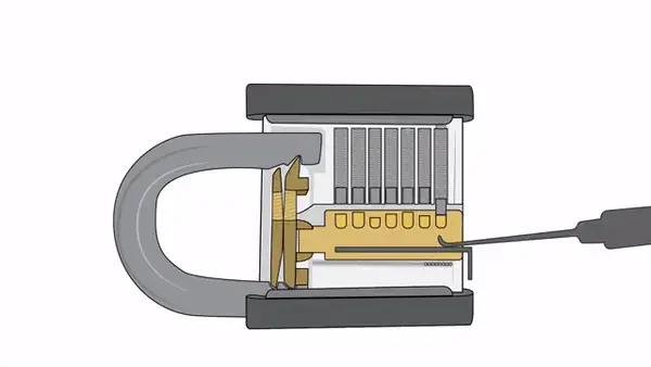在用张力扳手向键槽施加轻微压力的同时,我们将用镐将键槽内的销钉一个一个地推上去。当一个销子被抬起时,扳手的张力将防止它掉落,并且可以抬起下一个销子。当所有销子都抬起后,锁就会打开。