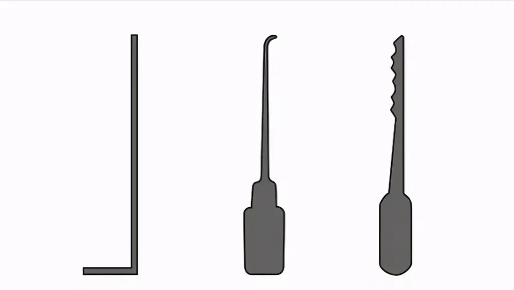 从左到右依次为:张力扳手,这种工具也称为扭矩扳手,是一块带有喇叭口的薄金属片。它是 L 形或 Z 形,L形比较常见。将其插入锁芯以对其施加张力。