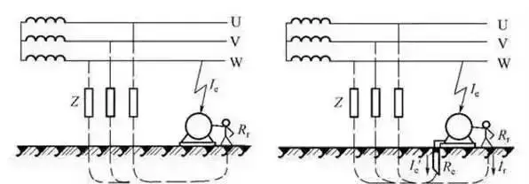 左图中,我们看到当发生单相接地故障时,由于地线的电阻远远小于人体的接触电阻,因此流过人体的电流被极大地减小了;右图中,系统未接接地线,因此当发生单相接地故障时,人体由于接触到了相电压,因此受到电击伤害的可能性极大。