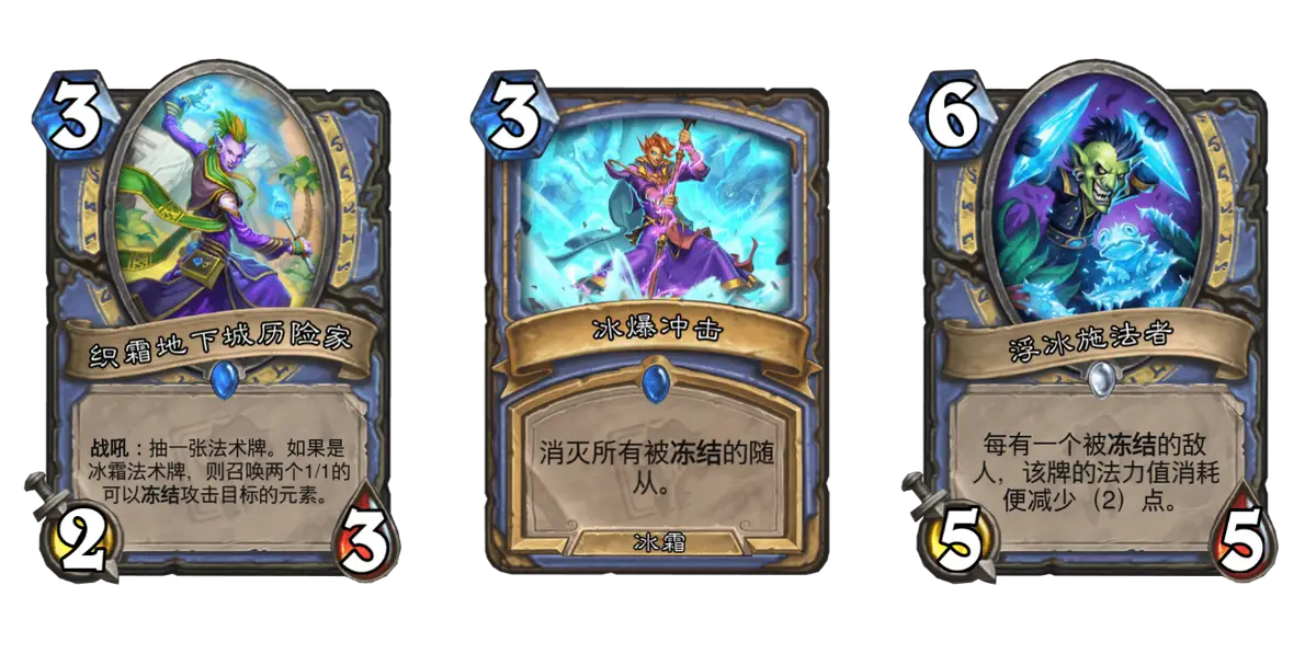 单纯从卡牌效果来看,法师的3张新卡都非常强力,织霜地下城历险者强化过牌,冰爆冲击强化解场,浮冰施法者则是强有力的进攻手段。它们不仅从不同角度加强了冰法,也明确了炉石传说当前版本的冰法思路:利用冰霜法术和带有冻结效果的随从控场,拖延对手的进攻和解场节奏,让法师的随从可以尽情输出。但是,纯冰法只靠浮冰施法者,输出似乎还是有所欠缺,该如何完善呢?