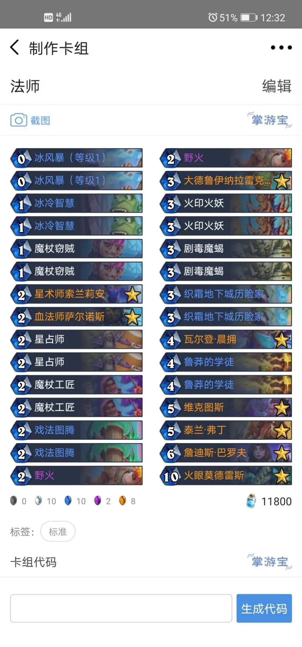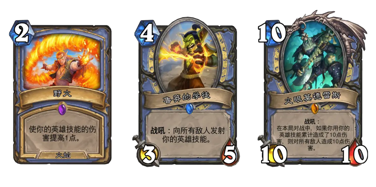 再来聊一聊火的部分,这部分主要是火冲体系的组件,顶多在算上一张火印火妖。火的部分除了10费的火眼墨德莫斯外可用于斩杀打爆发外,主要也是用来解场,可以与冻结打出配合。比如冻结拖延一回合,随从输出一波,然后等对手下了新的随从,再用鲁莽的学徒配合野火升级后的技能解一波场,随从可以继续输出。所以,冰与火其实是相辅相成的关系,目的都是为了让随从有理想的输出环境。