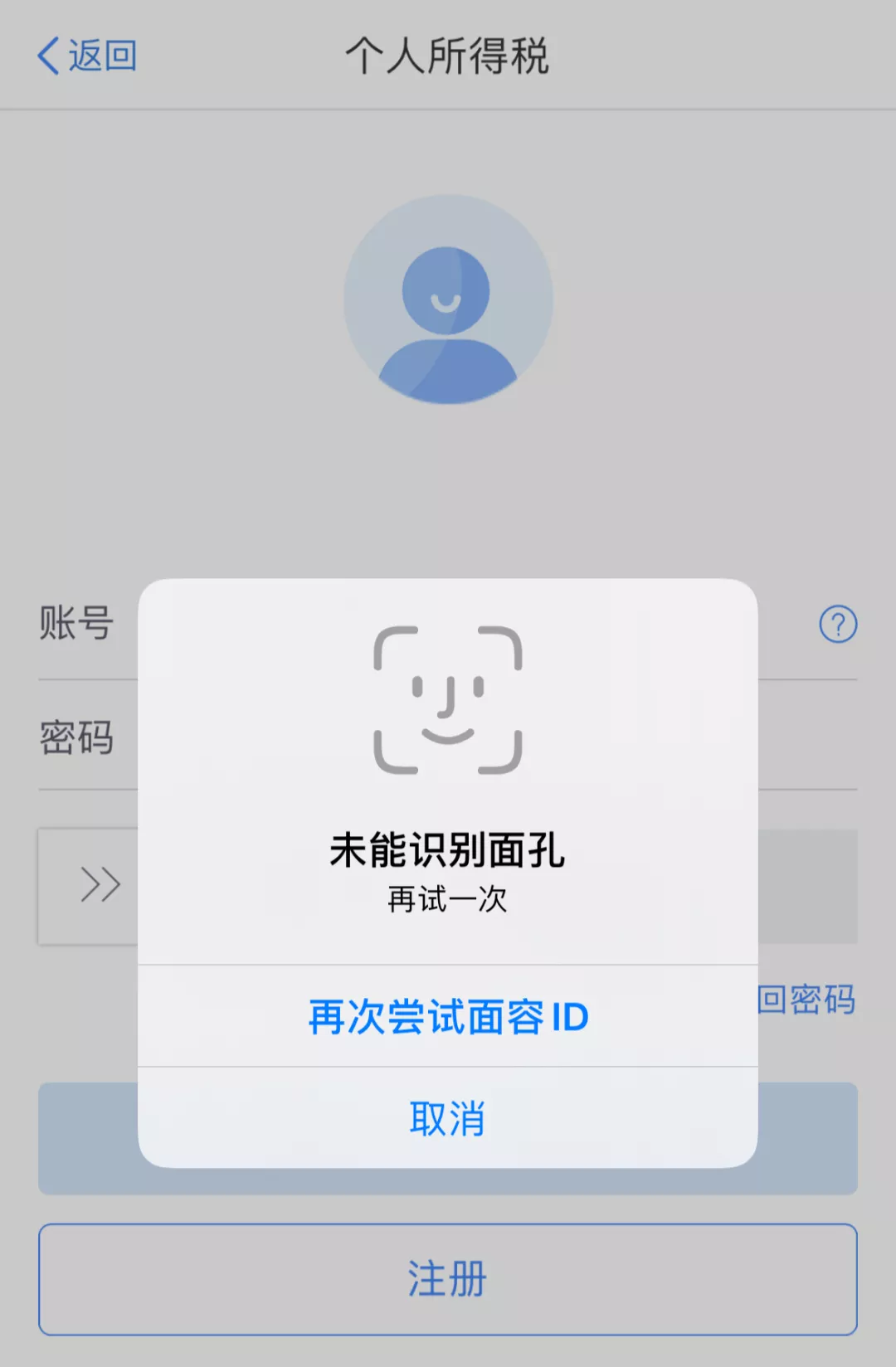 2、登录个人所得税APP,如果是首次注册的,可点击注册→人脸识别认证注册→填写个人信息。