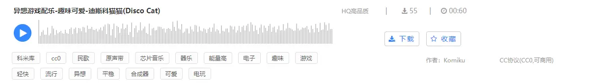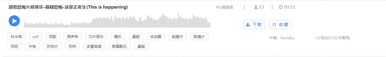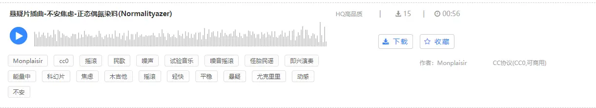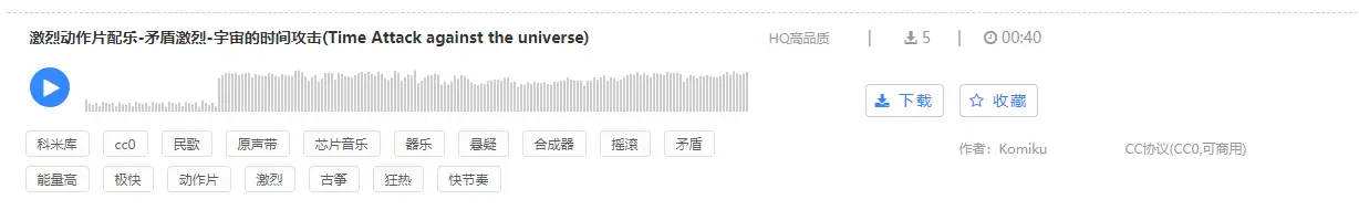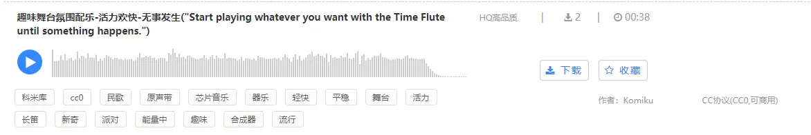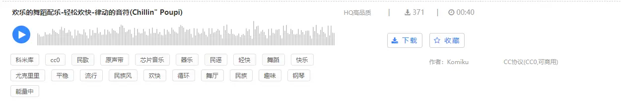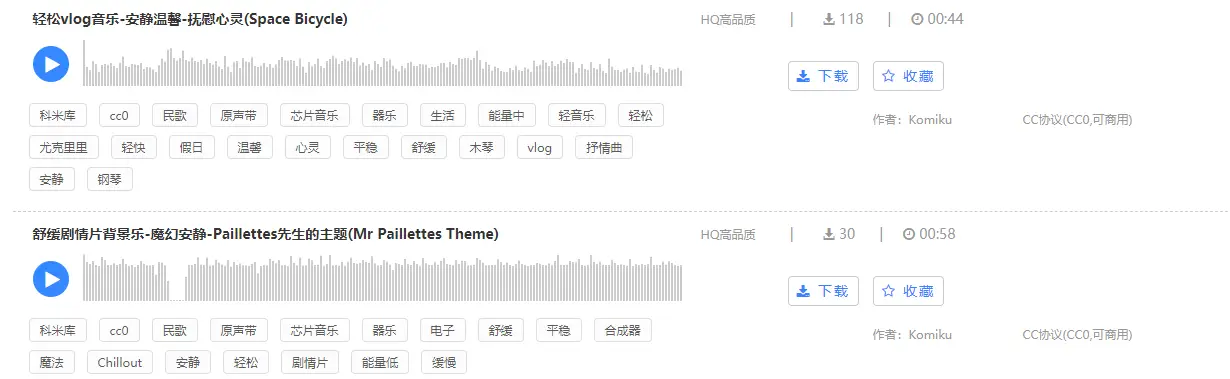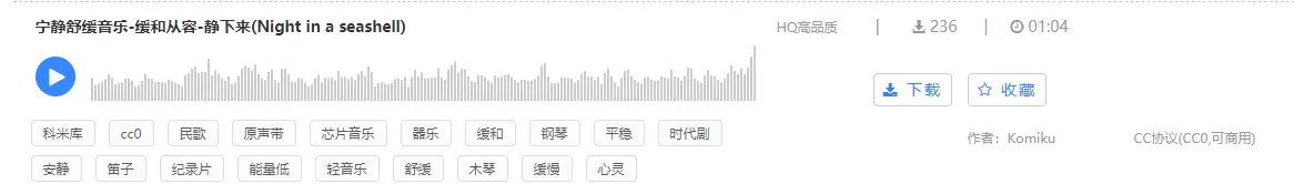 虽然这些配乐名字看得出是国外的歌曲,但每首配乐下面都会附有他所属的标签,这些配乐毋庸置疑都是属于民谣、民歌类的;其次也很明确标明它是舒缓、温馨的抒情曲;而且非常喜欢爱给这种排布展示方式,既展现了音质,还表明了作者名字和是否可以商用~