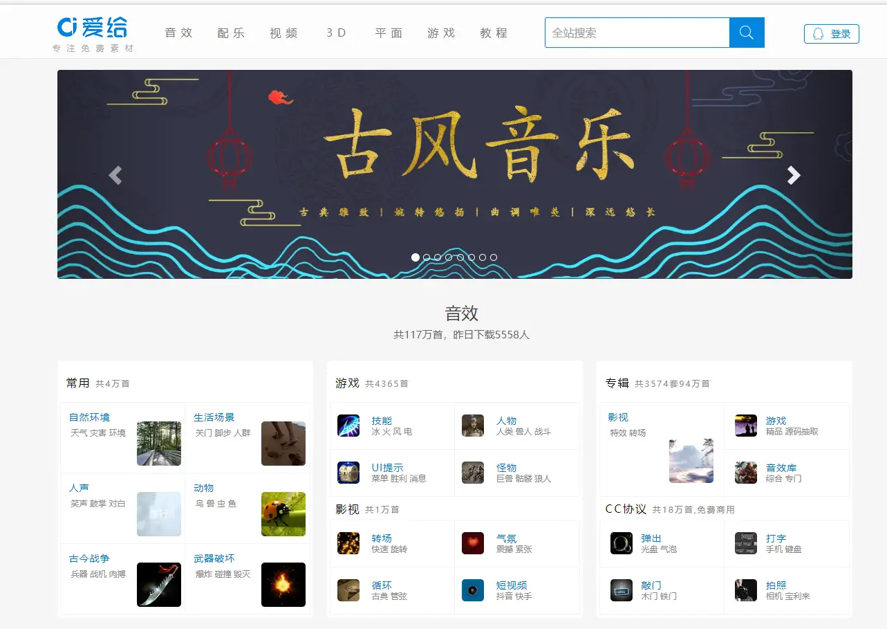还有很多类型的古风配乐等着大家去解锁,爱给网除了有古风配乐外,针对短视频的其他配乐都有哦,上万级的配乐资源总有你想要的,而且除了配乐外,还有音效,平面,模型各种素材