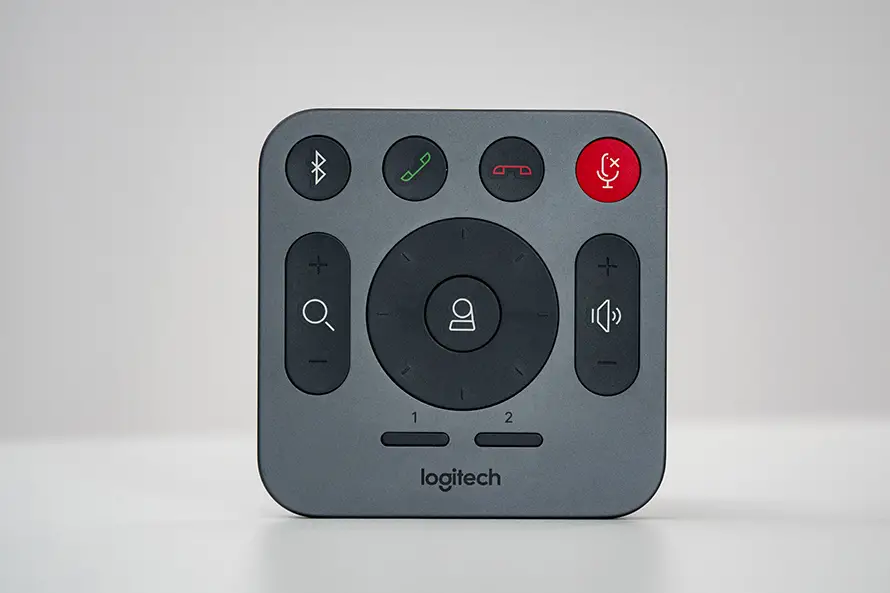 而在操控上,罗技CC5000e还提供了一个遥控器,造型也是相当别致,有着非常独特的工业设计风格。除了可以遥控摄像头转动、变焦之外,还支持接起、挂断会议、静音等操作。此外,遥控上还设置了两个快捷按键,可以把常用的摄像头角度、焦距等进行设置,以便会议时一键切换。当然,除了遥控器之外,你也可以下载对应的软件,来对会议系统进行操控、设置。