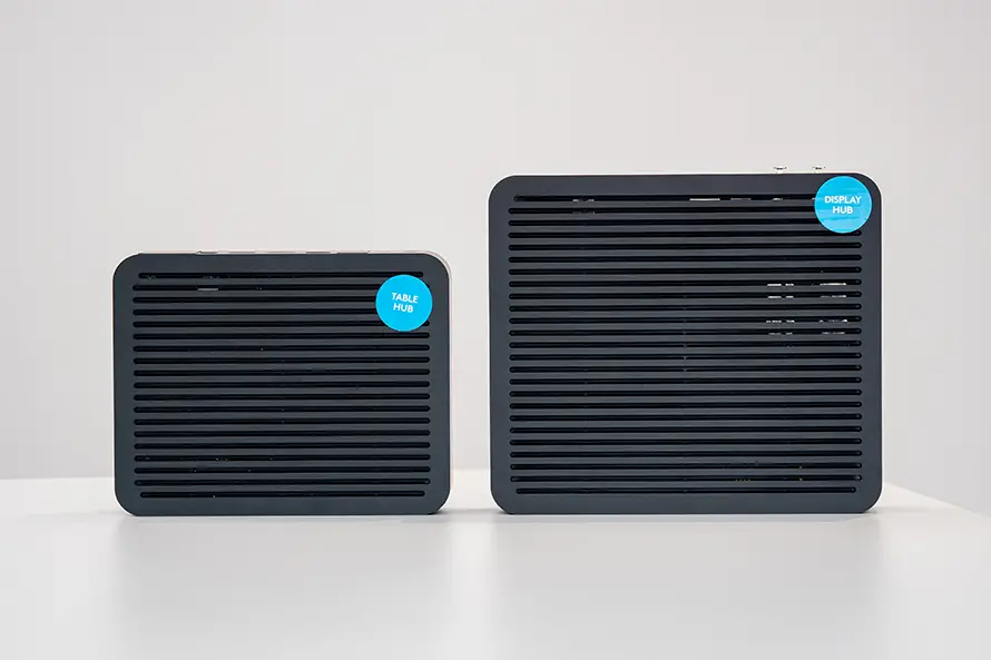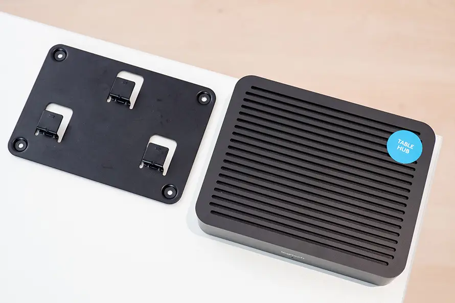 看完摄像头、麦克风、扬声器等几个设备,接下来就是整个会议系统同样非常重要的部分了,那就是两个集线器。在罗技CC5000e整个系统里,设置了两个集线器,分别为DisplayHub以及TableHub,看名字,就可以知道两个集线器,分别会被部署在显示屏以及会议桌的位置上。两者的造型基本差不多,不过DisplayHub稍微要大一些。