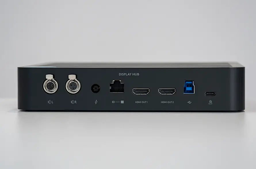 接口都位于集线器的后方,两者在接口设置上略有不同,以对应不同的功能。其中DisplayHub背后分别包括了两个扬声器接口、电源接口、网线接口、两个HDMI输出接口、USB接口以及摄像头接口。