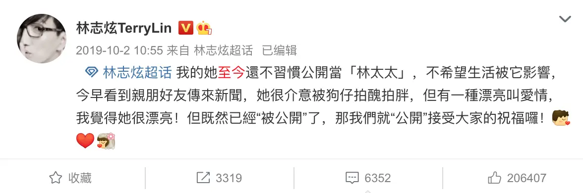 林志炫言简意赅,没有否认与Sara的恋情,甚至还祝福Sara早日找到幸福。