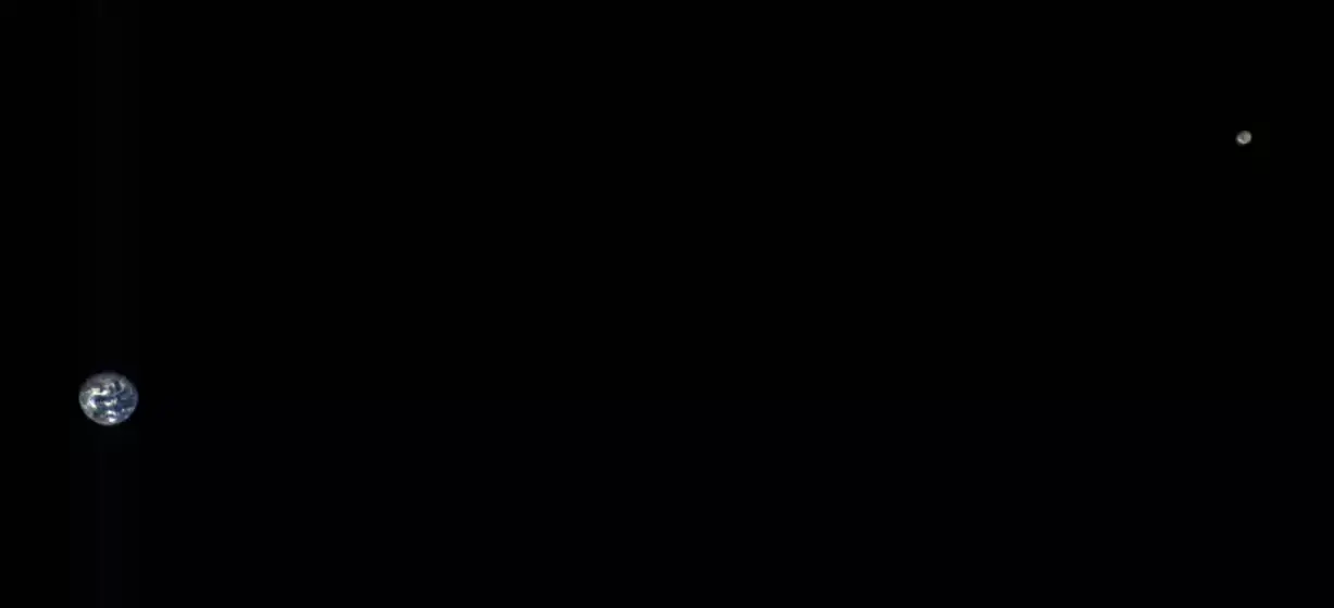 幸运的是,你不必想得太难,美国宇航局的航天器已经为我们解决了这个问题。OSIRIS-REx探测器在2018年八月与一个小行星相遇,十月的时候在距地球约500万千米的地方拍摄了这张照片。美国宇航局在2018年1月2日发布了这张照片,为公众提供了地球和月球的独特视角。这个角度可以很好地理解两个天体之间的距离,但却并不完美。