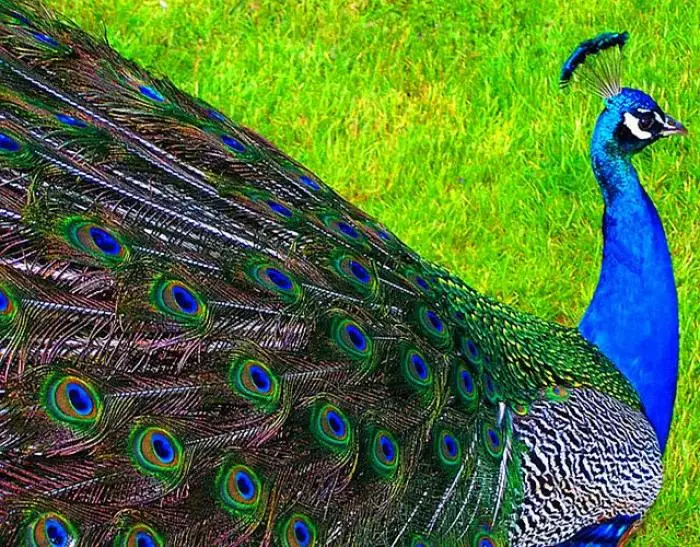 雌蓝孔雀羽毛艳丽,体羽主要呈翠绿蓝色;其头顶耸立呈扇状的羽冠;其覆尾羽特别长,富有光泽,在部分覆尾羽末梢可形成眼斑状图案,开屏时华丽夺目。