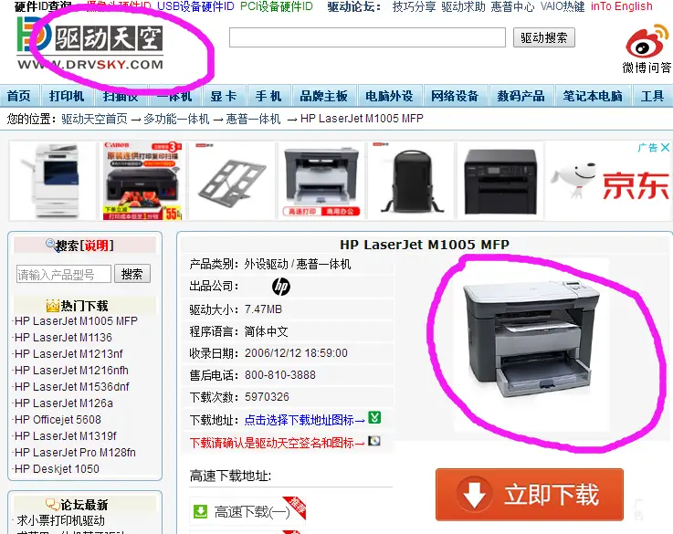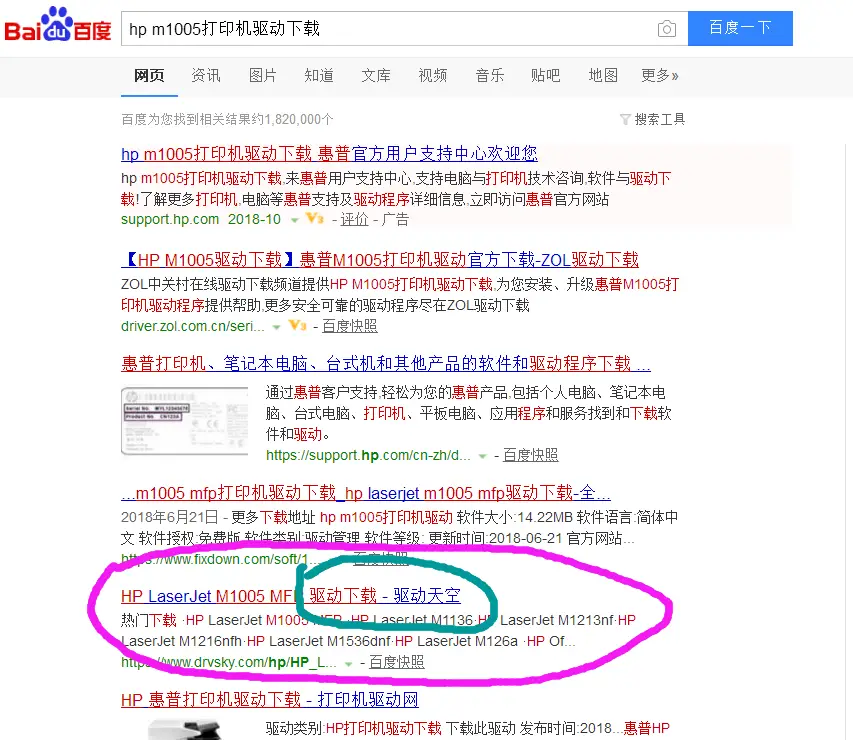 2、打开百度,输入:hp m1005打印机驱动下载,回车。找到有个“驱动天空”的网站,打开。其他都不要点。一般情况驱动天空这个网站会排到前5名。很好找。