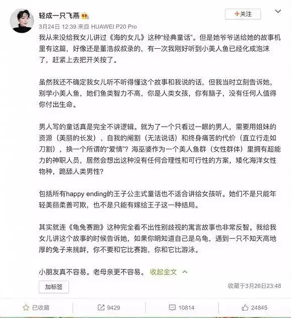 供儿童阅读的童话也免不了三观批判。安徒生童话一度被斥为“毒草”,家长称其会误导孩子三观,皆大欢喜的王子公主童话中更有矮化女性的问题。《丑小鸭》宣扬的是“血统论”、《海的女儿》则是不折不扣的“恋爱脑”故事。