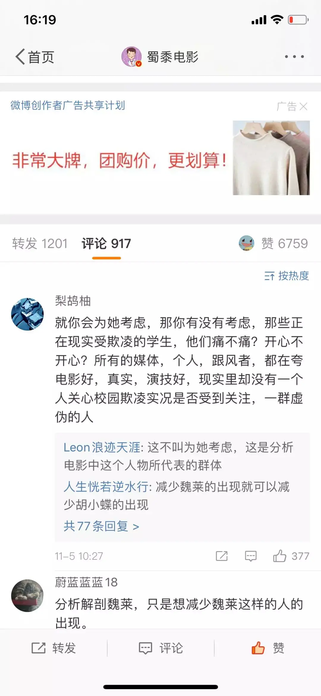 就像最近备受好评的电影《少年的你》,作为难得的现实题材作品,引起了网络上关于校园欺凌的广泛讨论。但关注点大部分集中在受害者的弱势境地,而对同样值得重视的施害者,更多的却是唾骂。微博上有一位电影博主,分析了影片中霸凌老大魏莱为何会使用校园暴力,以及此角色困顿的生活处境。本可以引导人们更加多元地去看待校园暴力、解决问题,其热门评论却是在斥责这个博主虚伪,为什么要为恶人考虑。可正如该评论中的回复所言:减少霸凌者的出现,就可以减少受害者的出现。