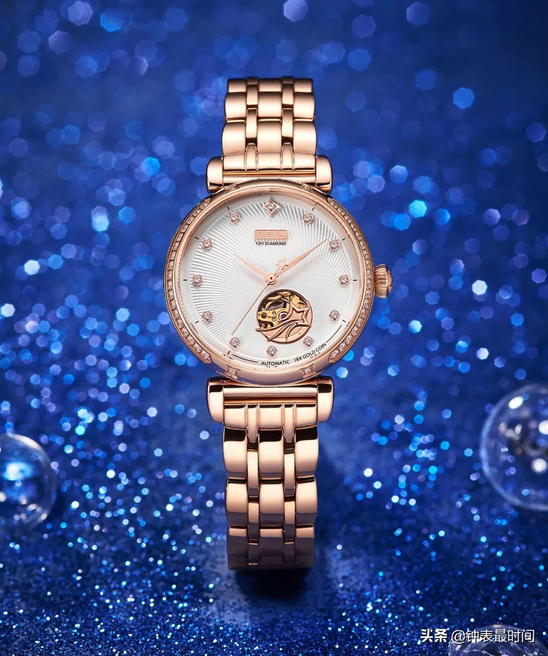 格雅星空系列Ⅱ金币款,12点位四芒星时标镶嵌真钻,璀璨光芒在腕间绽放;5点位18K玫瑰金流星金币,将瞬间流星化为永恒闪耀,搭配镂空机心设计,呈现机械运动之美;轨迹形时分针搭配星形秒针,优雅从容,记录人生精彩时刻;星轨式表盘压纹,将稍纵即逝的惊艳,定格成简洁唯美的表面;316L玫瑰金不锈钢表壳、表带,精钢材质精细打磨,佩戴舒适,玫瑰金流光溢彩、典雅浪漫;表圈镶嵌精美锆石,展现豪华贵气的品质。